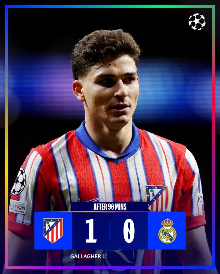 第1分钟,马竞反击,德保罗分边,西蒙尼右路传中,前点一漏,加拉格尔门前铲射破门,马竞取得梦幻开局,1-0!↓