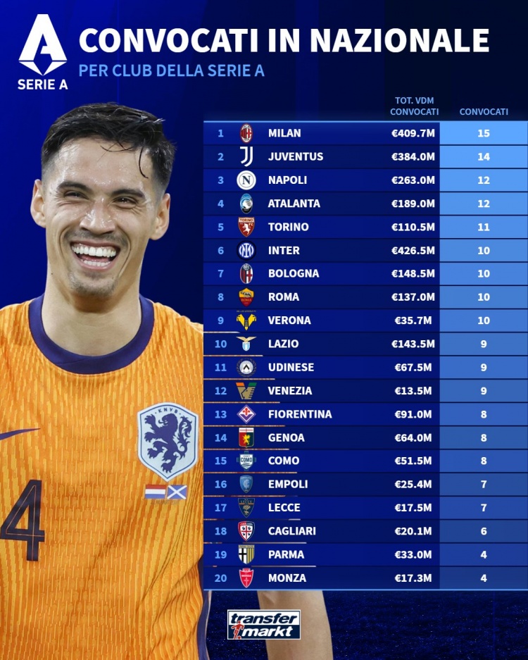 2025-03-18 21:18:53意甲国家队征召人数:米兰15人最多,尤文14人次席&国米10人