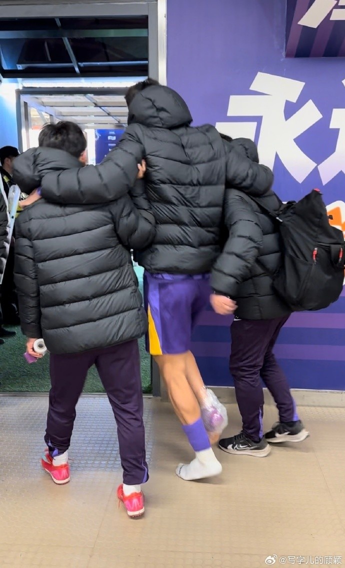 比赛中他去检查车拍CT时,脚踝已经肿了,当时看情形,队里最担心的是骨折。影像结果排除了骨折,意味着最坏的结果没出现,指向比较复杂的韧带问题,但是到底有多严重,需要核磁共振进一步认定,再制定恢复方案,而拍核磁大概也要等稍微消肿。估计于指导笼统说“最近几场无法登场”,也是这个原因。回到场地后,萨尔瓦多执意从担架车上下来,要返回球场和队友们在一起(就是这张图),结果于指导正好迎面而来,把他拦回休息室了。