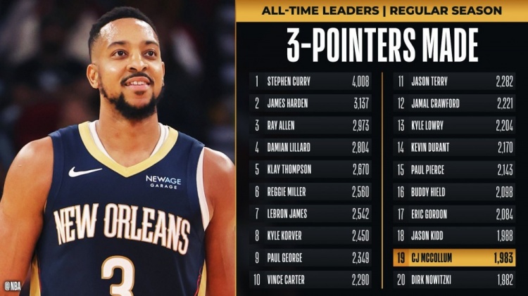 2025-03-20 11:53:19生涯能到多少?CJ三分命中数1983 超越诺维茨基升至历史第19