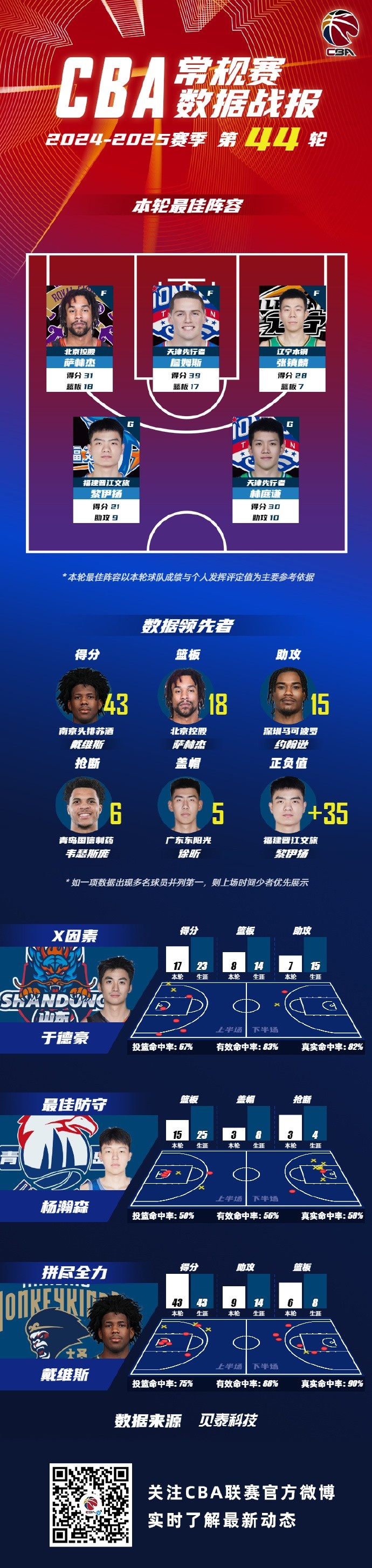 数据领先者方面:南京同曦篮球俱乐部球员戴维斯以单场43分的数据领衔得分榜;