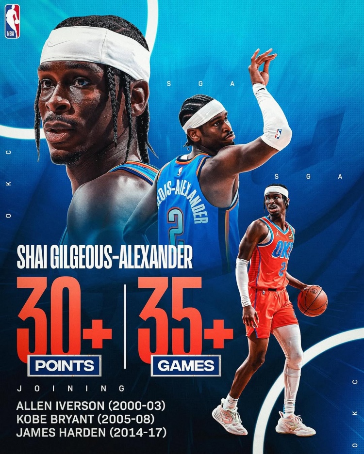 2025-02-27 18:20:28亚历山大连续三个赛季至少35场单场30+ 近25年来比肩AI科比哈登