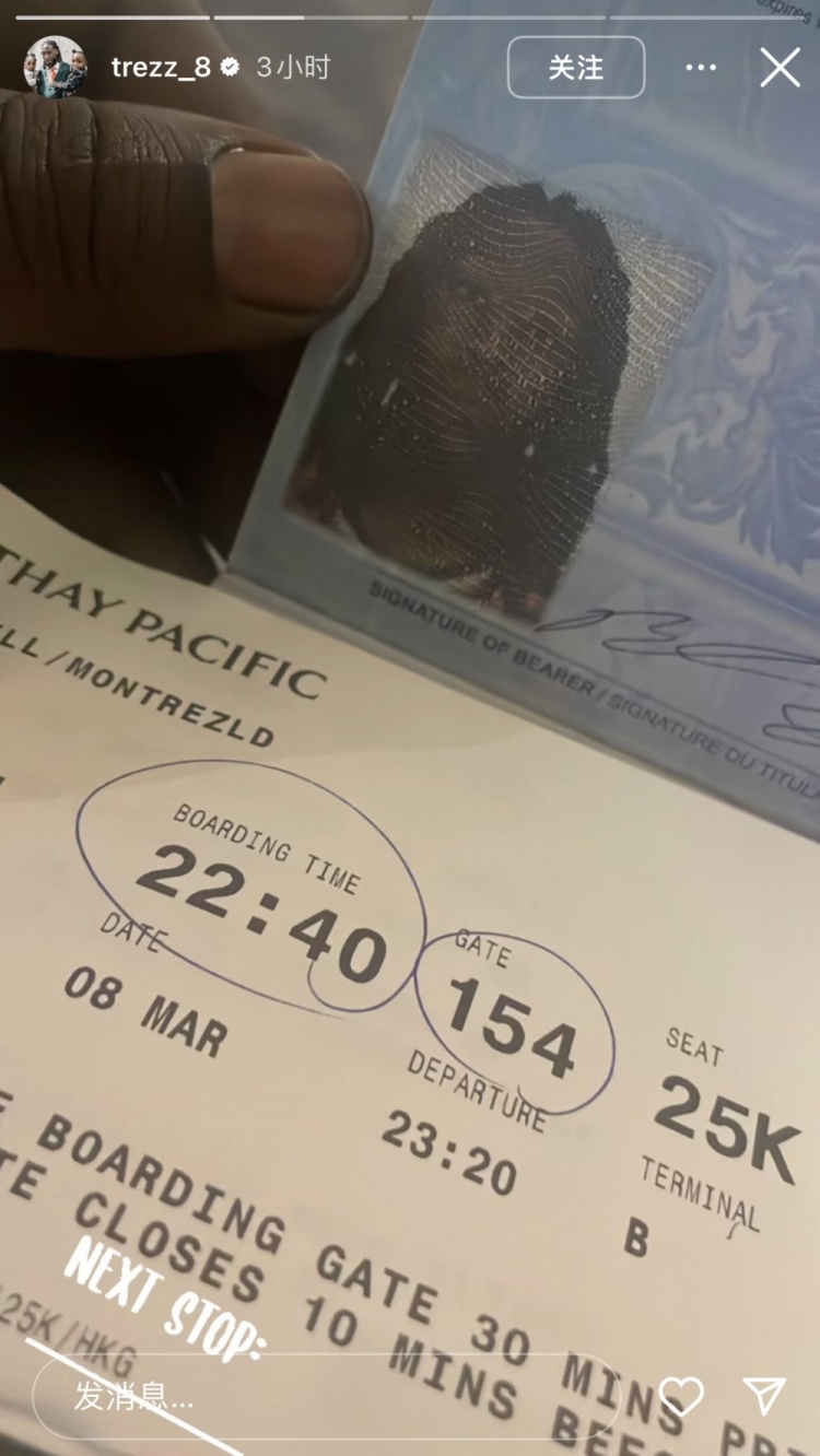 2025-03-09 18:35:16来了!哈雷尔社媒晒出机票 目的地为中国香港