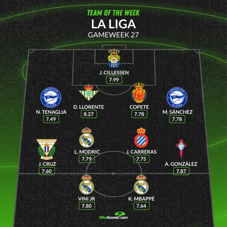后卫:泰纳利亚(阿拉维斯,7.49分)、迭戈-略伦特(贝蒂斯,8.27分)、科佩特(马洛卡,7.78分)、曼努-桑切斯(阿拉维斯,7.78分)