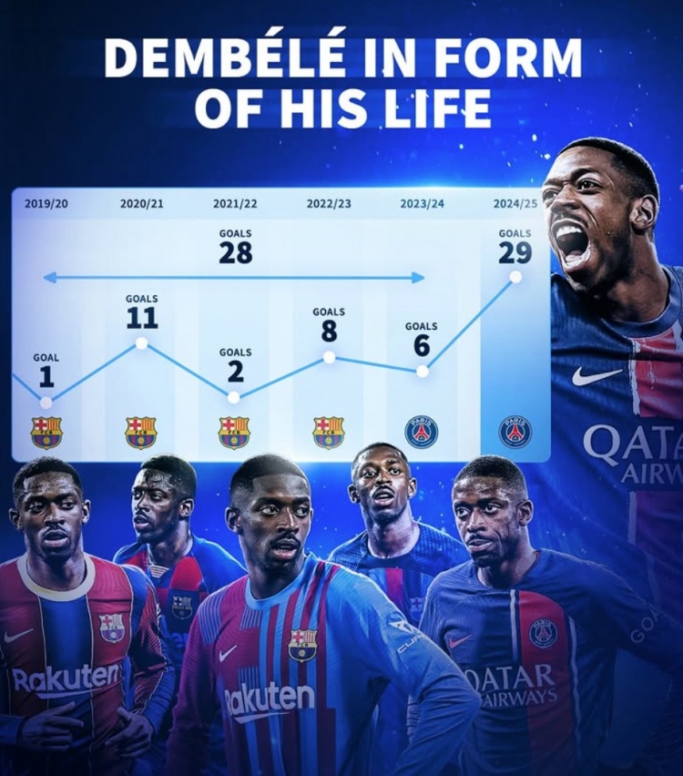 2025-03-12 09:35:52真-登球王!登贝莱本赛季狂轰29球,此前为巴萨&巴黎5赛季共28球