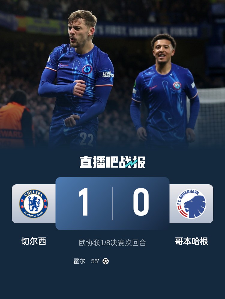 欧协联-切尔西1-0总比分3-1哥本哈根晋级八强 霍尔低射破门制胜