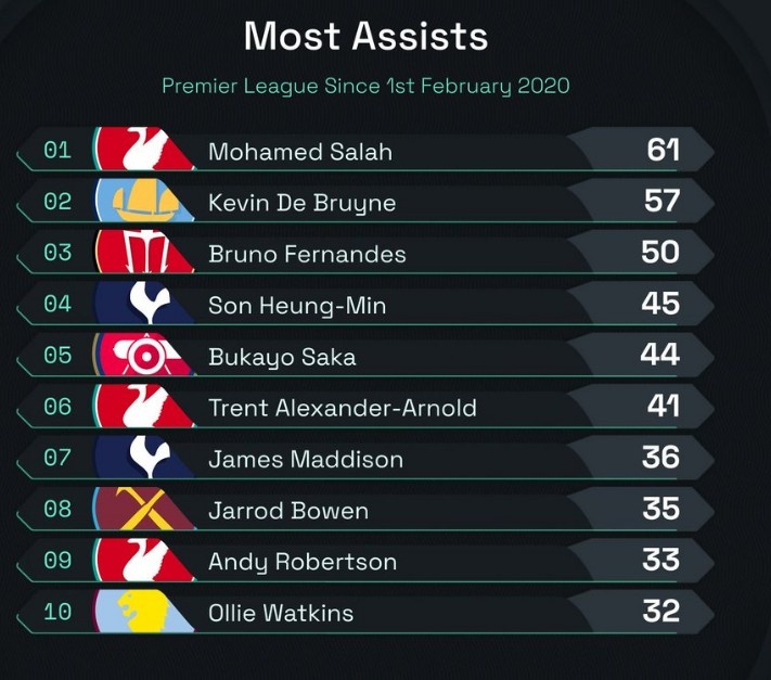 2025-03-17 06:29:21自B费首秀以来英超助攻榜:B费50次第三,仅次于萨拉赫&德布劳内