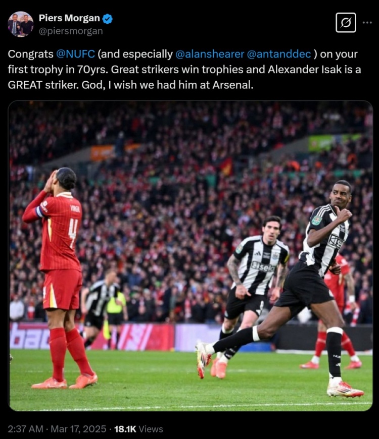 2025-03-17 06:32:01摩根:祝贺纽卡时隔70年夺冠 有好前锋能夺冠&希望枪手能签伊萨克