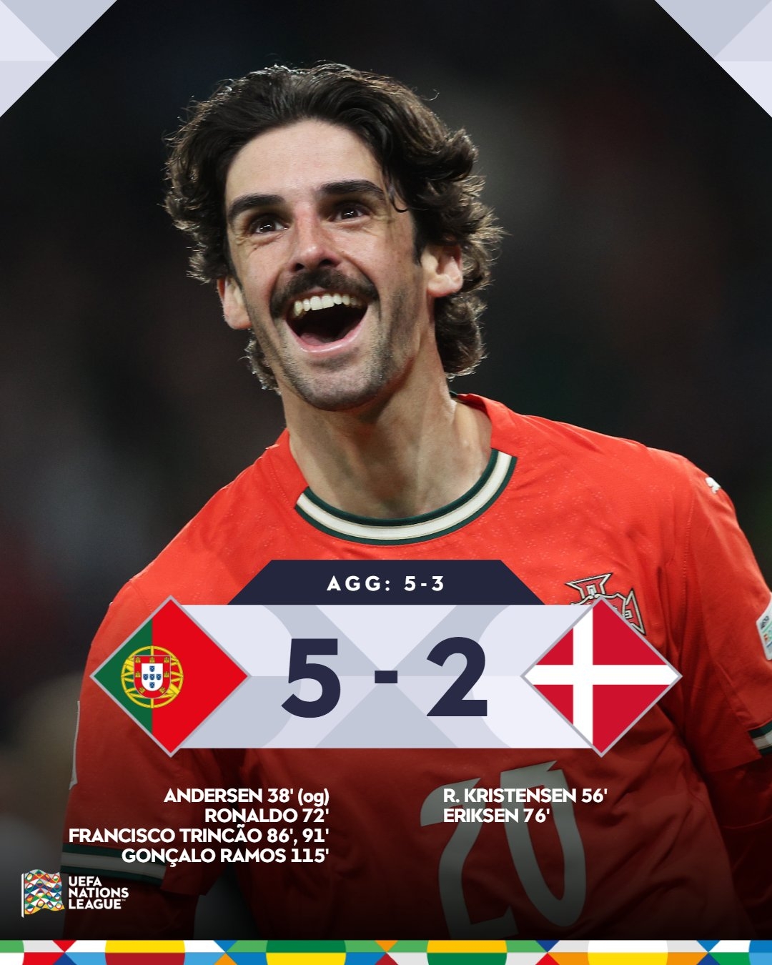 欧国联八强战次回合,葡萄牙5-2,总比分5-3战胜丹麦,C罗失点+破门。