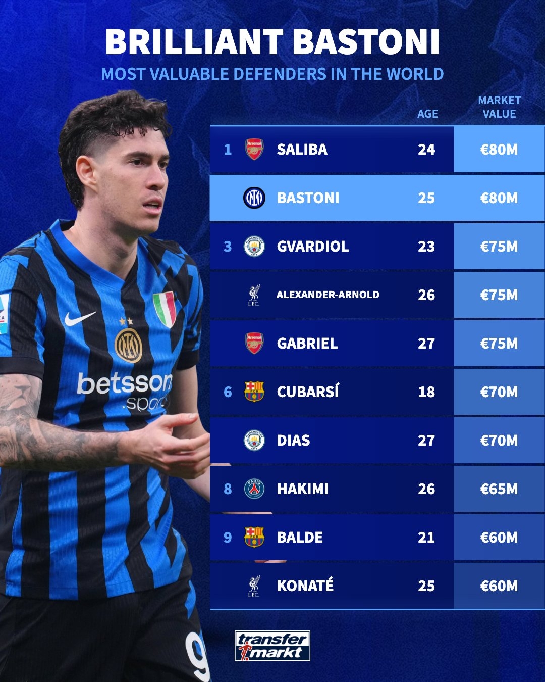 2025-03-26 08:45:46德转最新后卫身价top10:巴斯托尼8000万欧,与萨利巴并列第1