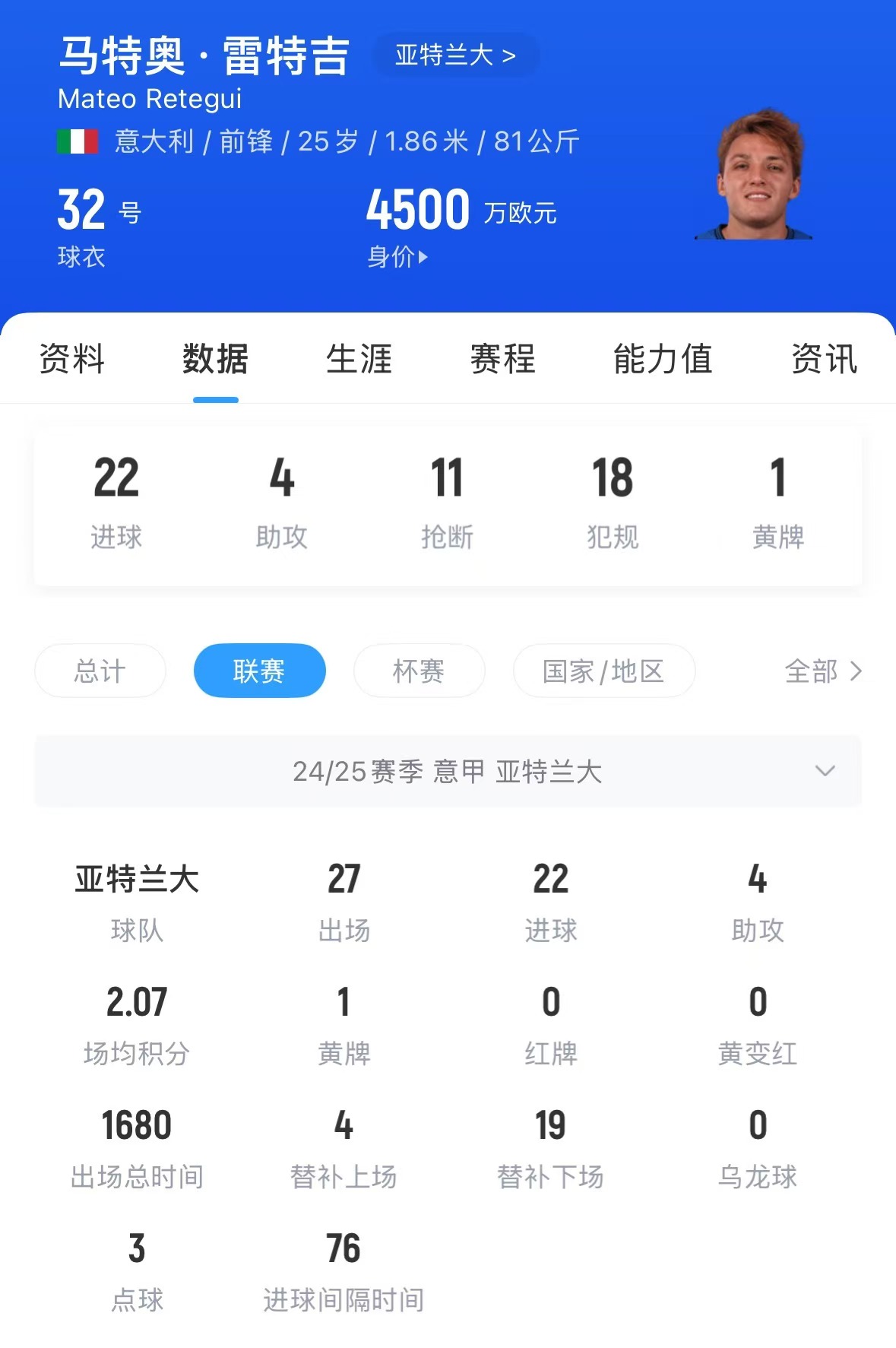 2025-03-26 22:10:01要价6000万!25岁雷特吉27轮22球意甲第1 身价涨至4500万多队有意