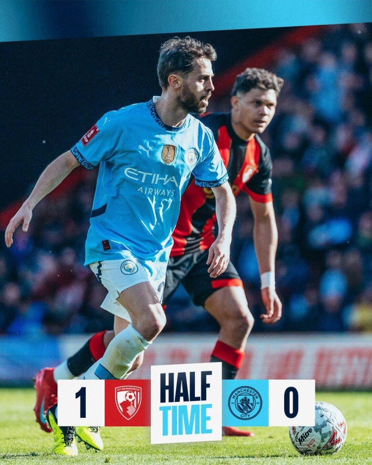 2025-03-31 07:27:21半场-曼城暂0-1伯恩茅斯 哈兰德失点&失单刀努内斯失误致丢球