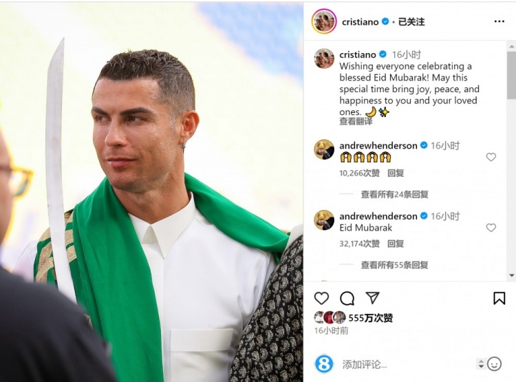 2025-03-31 17:36:56C罗社媒送开斋节祝福:愿这个日子给大家带来喜悦、安宁与幸福