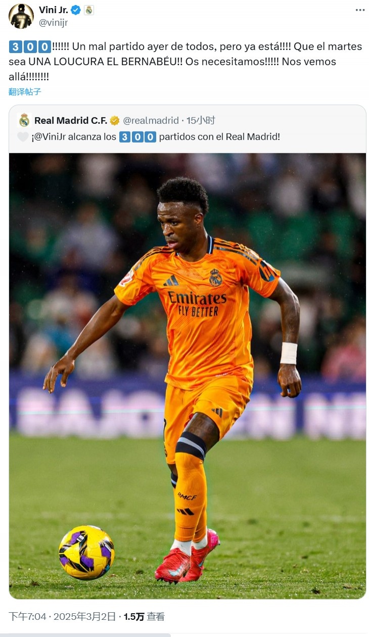 2025-03-02 19:24:41维尼修斯社媒:300场里程碑!一场糟糕的失利,但下周二还有大战
