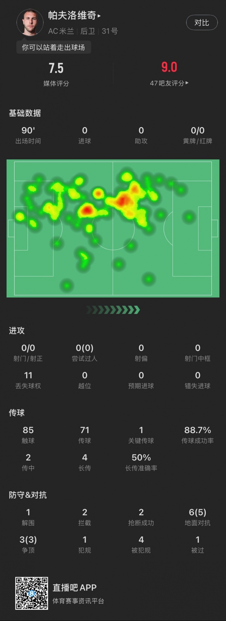 2025-02-19 20:28:57尽力局!帕夫洛维奇本场:9次对抗成功8次,贡献1解围2拦截2抢断
