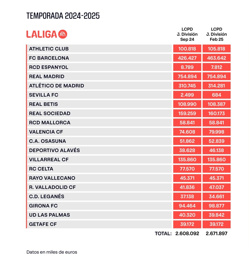 2025-02-19 20:29:27西甲最新工资帽:皇马7.55亿欧居首 巴萨4.64亿欧第二