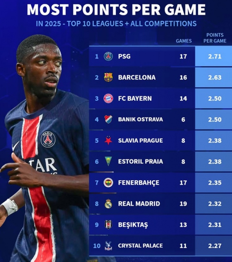 2025-03-08 06:19:172025年各项赛事场均拿分榜:巴黎巴萨拜仁前三,皇马费内巴切在列