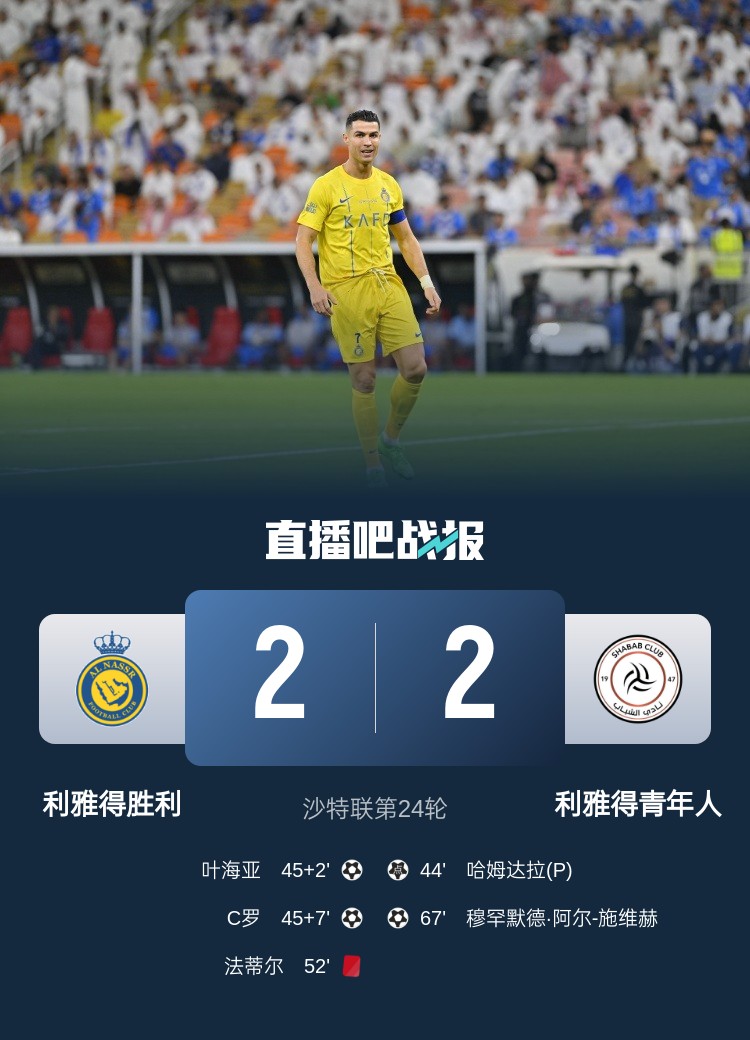C罗破门,十人胜利主场2-2战平青年人。胜利各赛事近6场仅1胜,距榜首吉达联合10分。