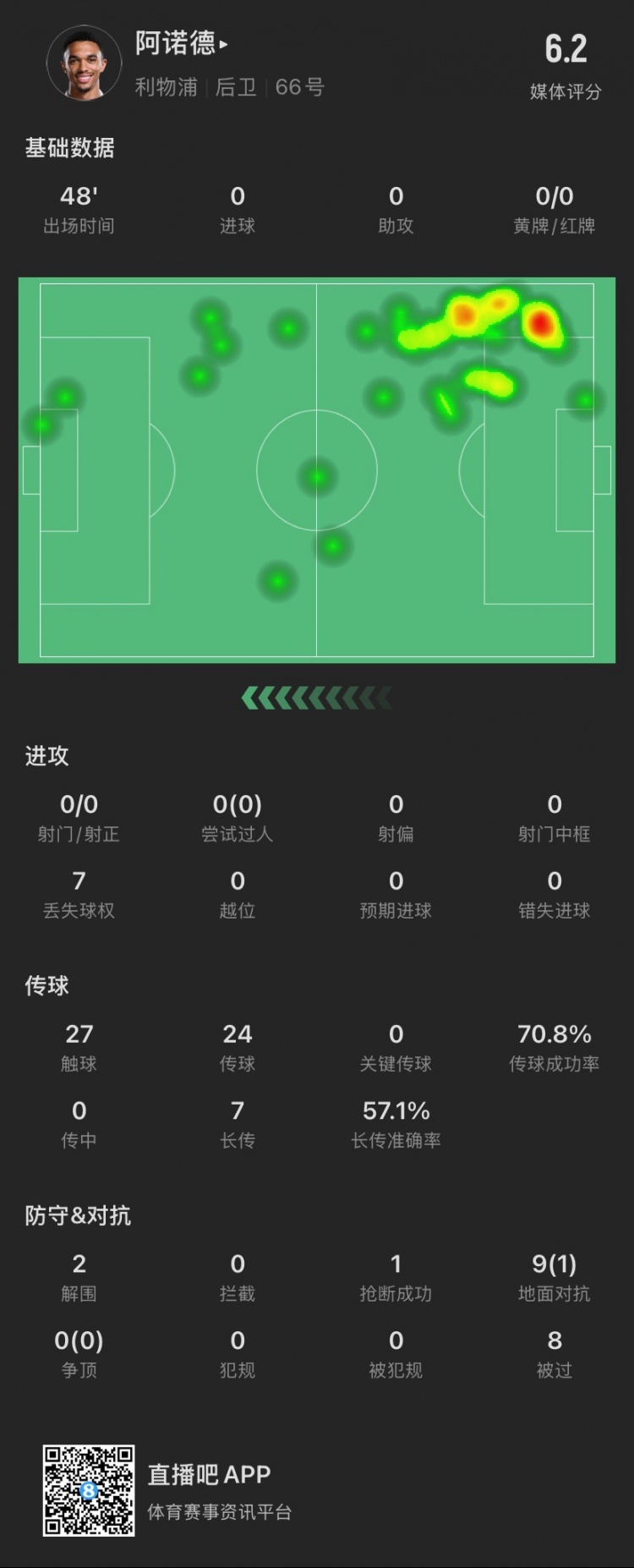 2025-02-24 12:15:47阿诺德半场:被过8次追平本赛季纪录,9次对抗成功1次,贡献2解围